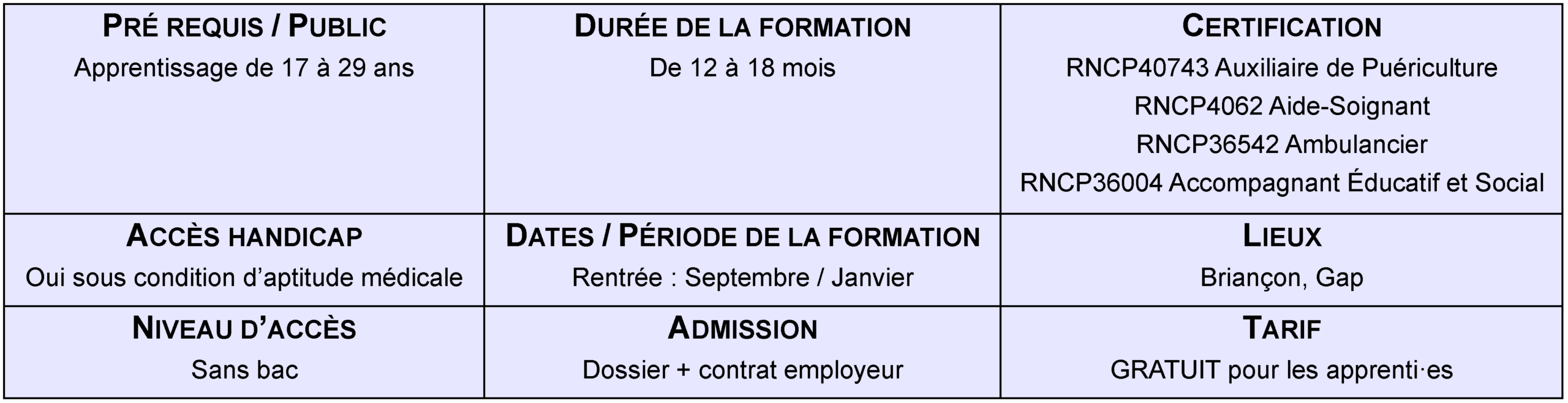 Nos formations aux métiers du sanitaire et du social accessibles en apprentissage :